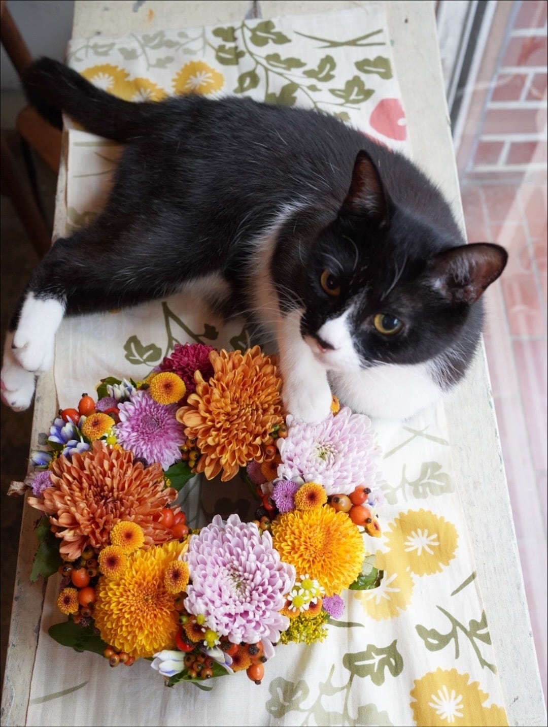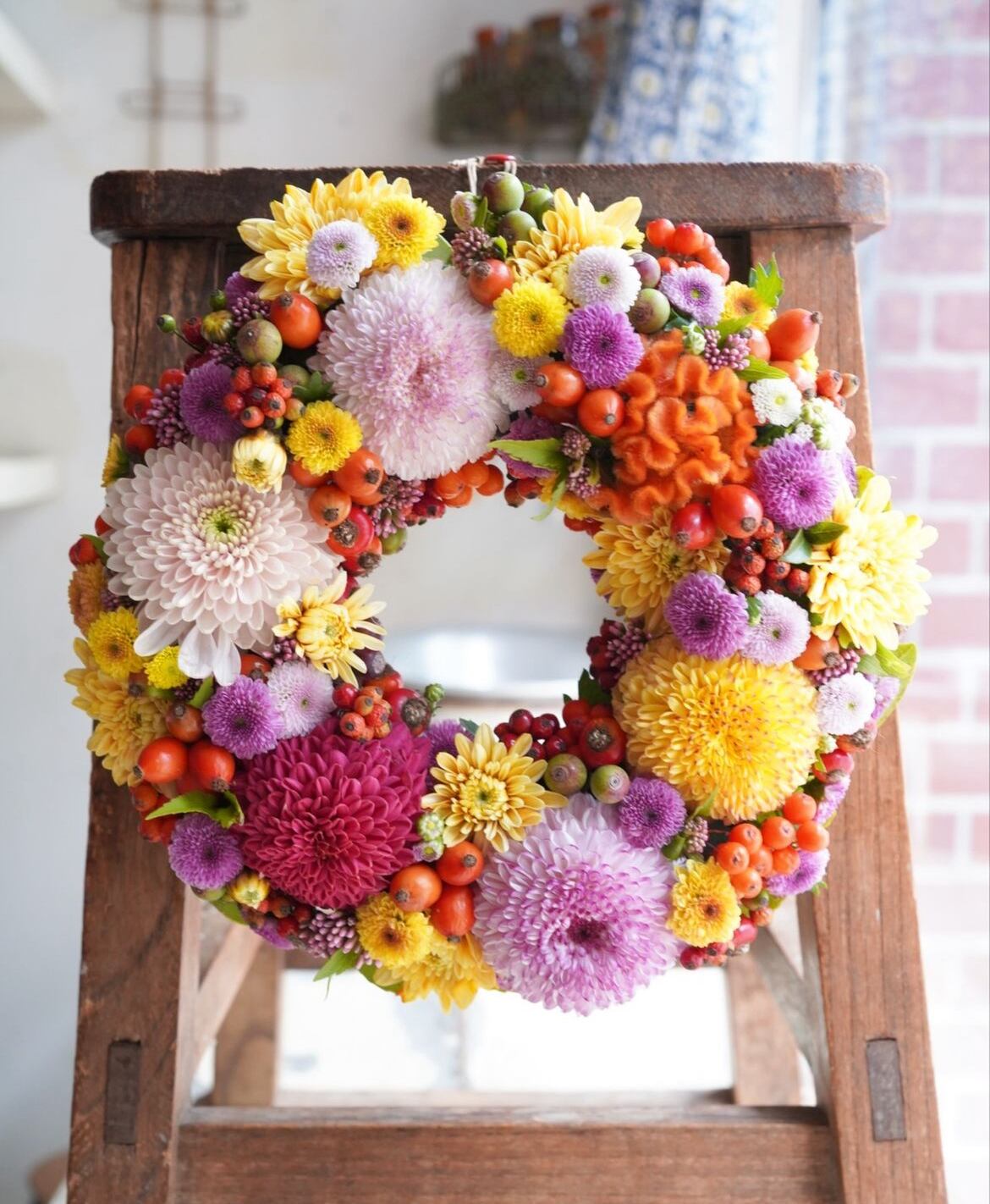 持ちのよい、カラフルなマムたちと稔りの秋の実ものたちをたっぷり集めたリースが仕上げます☆