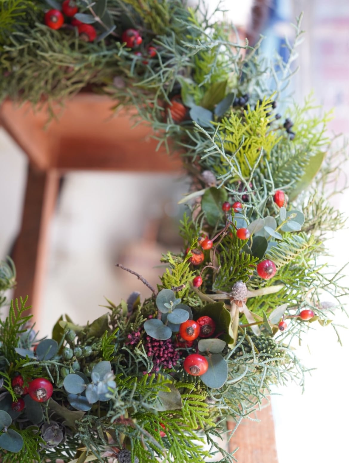 クリスマスカラーな色合いで実ものと葉ものをあしらった